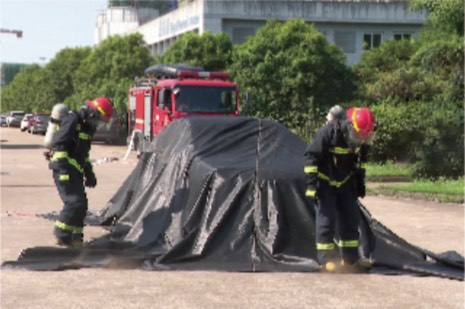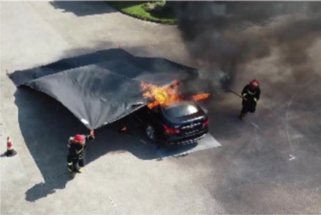 只需拖动多功能灭火毯覆盖在燃烧的车辆上,形成内外隔绝氧气,火焰很快被熄灭。